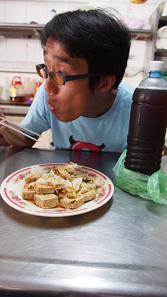老公正很爽的吃著大盤$100的林家臭豆腐(小盤$50)